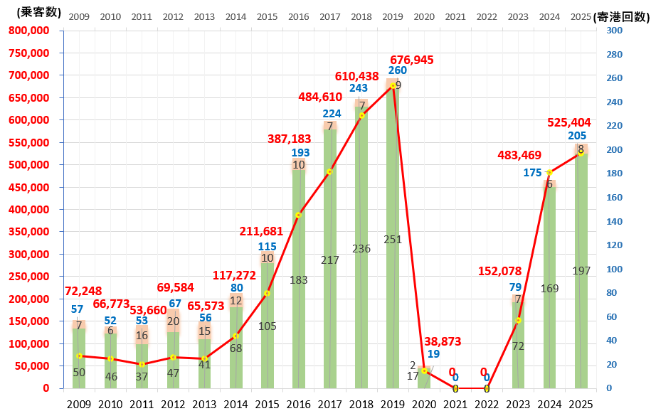 その後、新型コロナウイルス感染症拡大の影響を受けましたが、2025年の寄港回数は計205隻のクルーズ客船が那覇港を訪れ、順調に回復しております。
